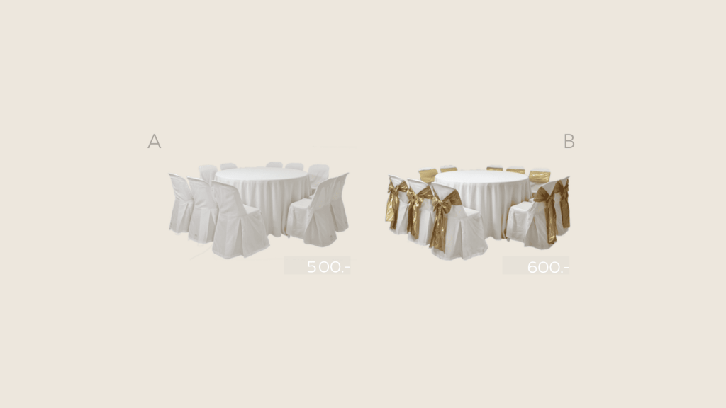 รายละเอียด : โต๊ะกลมขนาด 1.5×751, ผ้าคลุมโต๊ะกลม(เลือกสีได้) 1 ผืน, เก้าอี้พลาสติก 10 ชิ้น, ผ้าคลุมเก้าอี้ สีขาว 10 ชิ้น