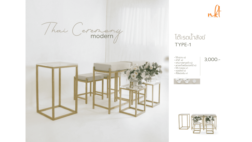 Type-1 ราคา 3,000.- บาท/วัน ประกอบด้วย โต๊ะกราบ 2 ชิ้น, เก้าอี้ 2 ชิ้น, แท่นวางพานแก้ว 2 ชิ้น, โต๊ะวางของ 1 ชิ้น, หอยสังข์ 2 ชุด, ที่ใส่แป้งเจิม 1 ชิ้น