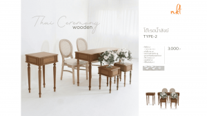 Type-2 ราคา 3,000.- บาท/วัน ประกอบด้วย โต๊ะไม้ ขนาด 120x40x75 1 ชิ้น, เก้าอี้หวาย 2 ชิ้น, แท่นวางพานแก้ว 2 ชิ้น, โต๊ะวางของ 1 ชิ้น, หอยสังข์ 2 ชุด, ที่ใส่แป้งเจิม 1 ชิ้น